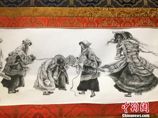黄家林介绍,该藏戏主题钢笔画卷长27.42米,历时一年多完成。创作期间他曾深入藏区各地采风、翻阅相关文史资料,与藏戏表演者学习交流。该作品内容涵盖了藏戏鼻祖唐东杰布人物、藏戏服饰、面具、舞蹈动作、首饰等描绘。
