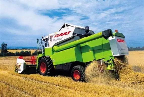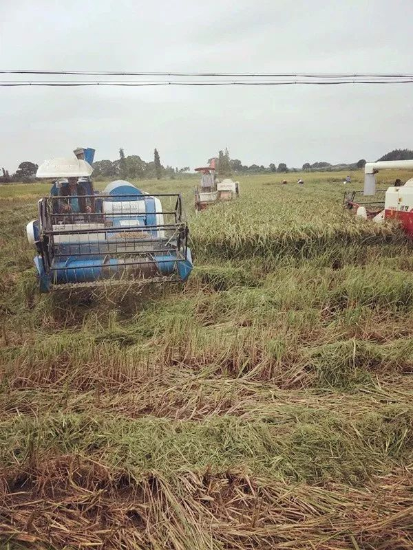 这是奉新万亩连片水稻高产区 ,一台台收割机在田间来回穿梭, 开个机器跑几圈就大功告成了 !