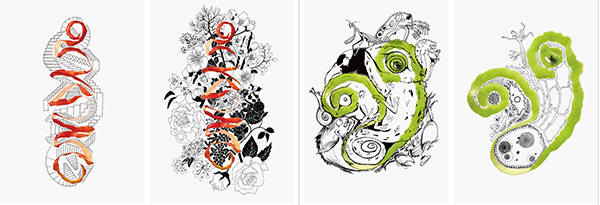 展览的第一部分,呈现了14个展柜,对应设计思维中14个概念,如分解、长度、面积、涂鸦、拟声词、联想游戏、思考的素材、漫画等。在关于“涂鸦”的部分,削下来的苹果皮被凹成3种造型,涂鸦者以“苹果皮”的形状为起点进行涂鸦,与在一张白纸上随意涂鸦不同,在同苹果皮的互动中,学习者开始探索形状的关联并想象故事性。