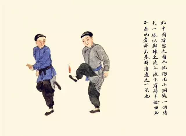 此物用小铜钱一个,缚毛一根(或一撮),以脚蹄之,遂上遂下,有蹄千余回而不落地者,亦天寒时消遣之一法也。