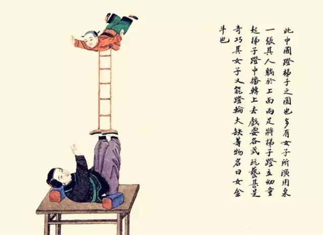 多有女子所演,用桌一张,其躺于上面,两足将梯子蹬立,幼童从梯子档中翻转上去,戏耍各式玩艺,甚是奇功。其女子又能蹬抡大缸等物,名曰千金斗也。