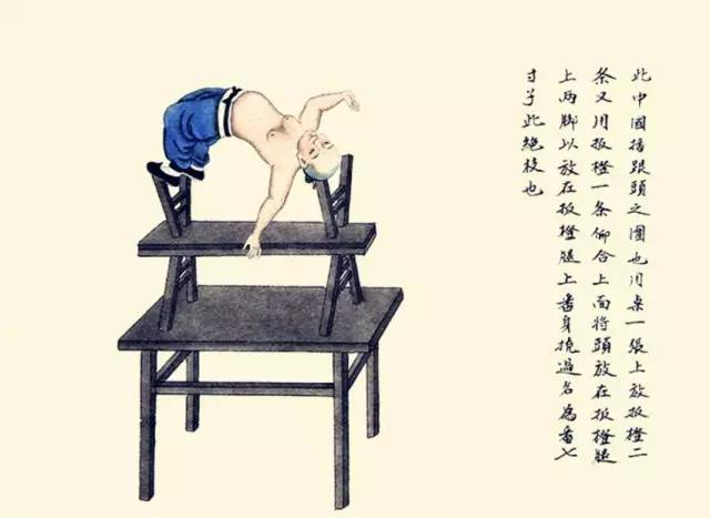 用桌一张,上放板凳二条,又用板凳一条仰合上面,将头放在板凳腿上,两脚亦放在板凳腿上,翻身“挠”过,名为翻七寸子,此绝技也。