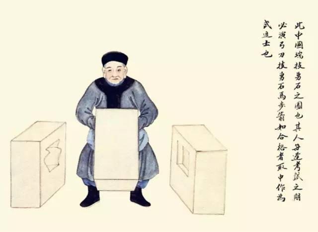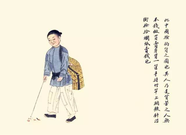 其人乃是贫苦之人,无本钱做买卖,身背一框,手持竹杆,上捆铁针,沿街捡拾烂纸买钱也。