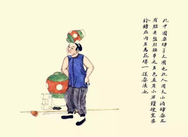 此人用大小酒坛耍之,有“脑尖盘”、“肘腰串”之名色。并有小石锁馊空,安铃铛在内,名为花砖,一样耍法也。