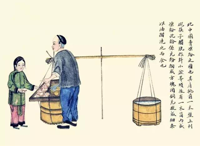 其户挑前一木盆,上列碗、筷子、醋瓶、作料、小盆等项,后有一木桶,内盛凉粉,此粉系元粉淘成方块,用铜片旋成细条,以油、醋浇之而食之。