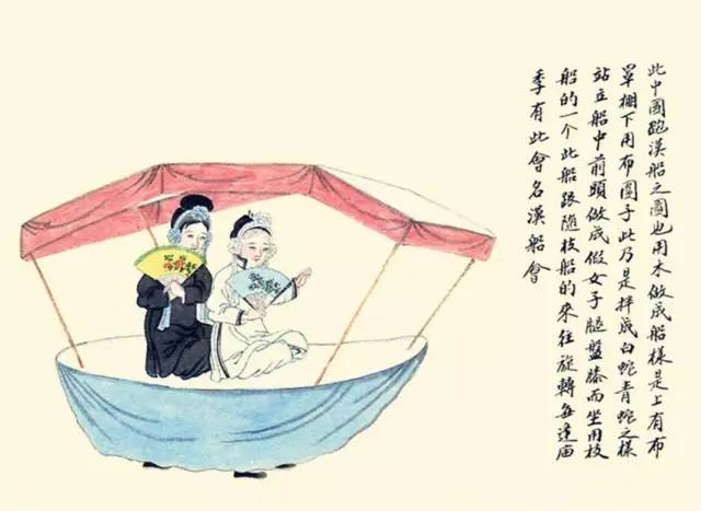 用木做成船样式,上有布罩,下用布围子。此乃是扮成白蛇、青蛇之样,站立船中,前头做成假女子腿,盘膝而坐。用支船的一个,此船跟随支船的来往旋转。每逢庙集有此会,名早船也。