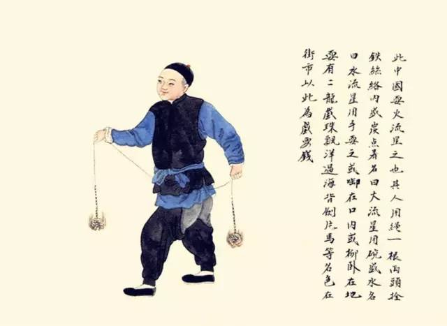 其人用绳一根,两头拴铁丝络,内盛炭点着,名曰火流星。用碗盛水,名曰水流星。用手耍之,或衔在口内,或仰卧在地耍,有“二龙戏珠”、“漂洋过海”、“背剑”、“骗马”等名色,在街市以此为戏耍钱。