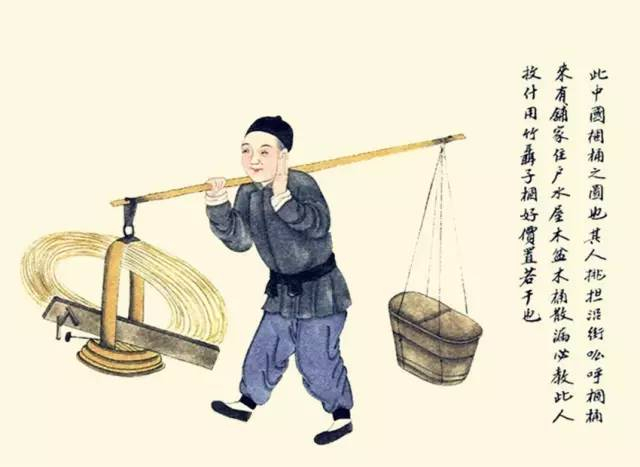 其人挑担沿街吆呼:“箍桶来!”有铺家,住户水屋木盆木桶散漏,必叫此人收拾,用竹蔑子箍好,价值若干也。