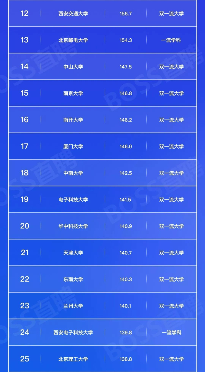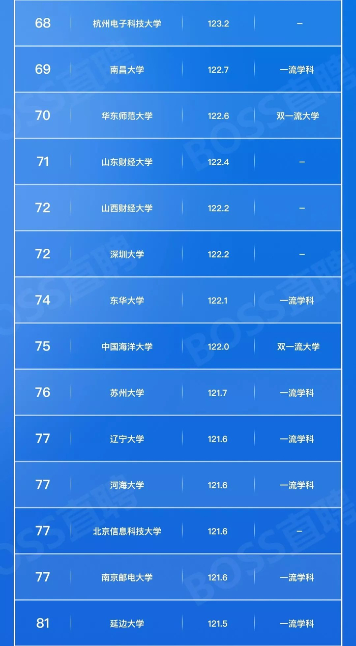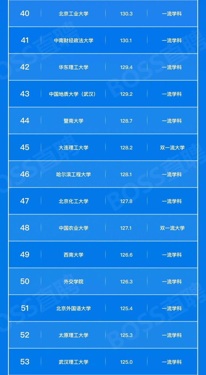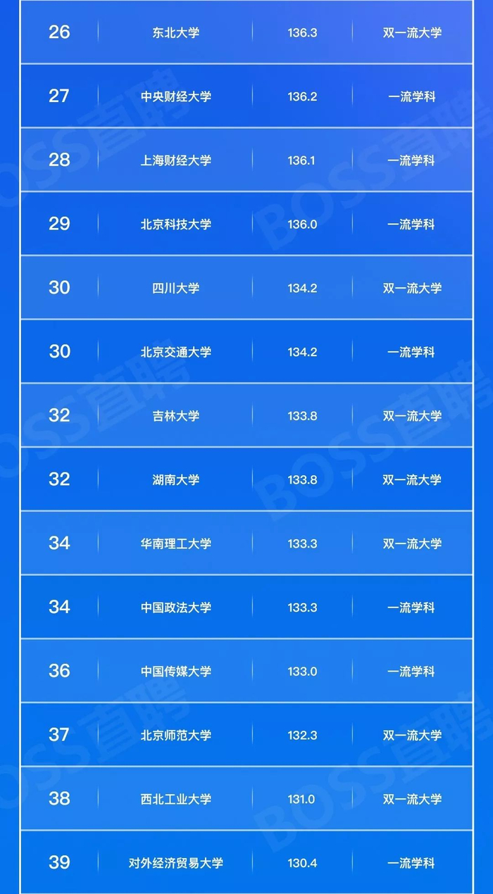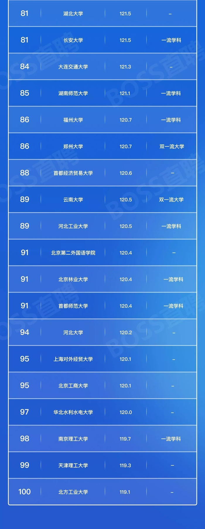 通过分析国内高校2017年毕业生的起薪、5年薪资成长空间、简历热度、职业成长路线等维度数据,BOSS直聘建立数据模型,计算高校毕业生就业竞争力指数。指数越大,表明该校毕业生在就业市场上的竞争优势越大,在基础条件相同的情况下,与其他人竞争同一岗位时,更容易获得工作机会,且未来薪资增长空间更大。