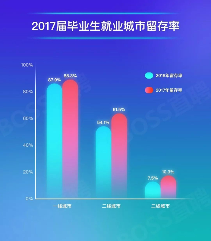 BOSS直聘人才大数据显示,2017年,有61.7%的在二线城市读书的高校毕业生选择留在当地工作,较2016年增长了7.6个百分点。