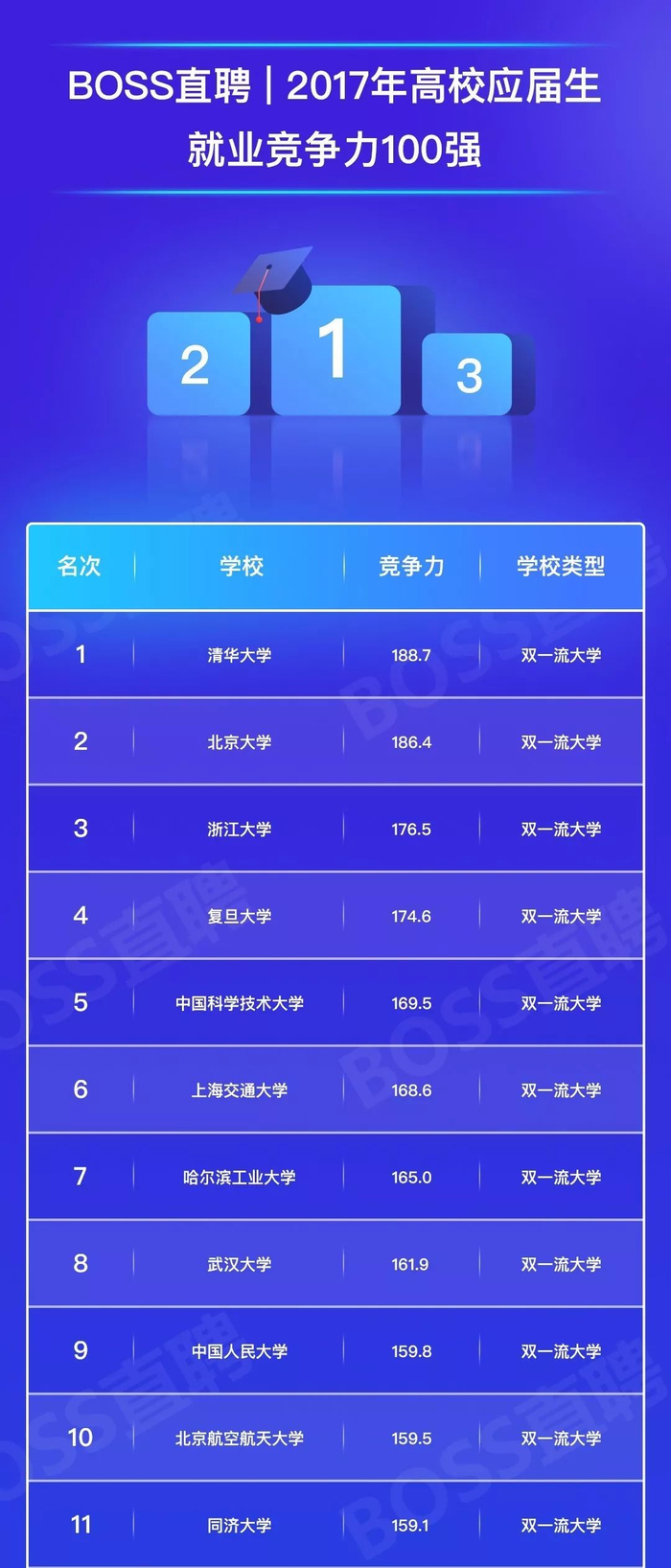 毕业生就业哪家强?一起看看《2017高校应届生竞争力报告》和《2017年高校毕业生就业竞争力100强》的数据。(来源:BOSS直聘 ID:bosszhipin)