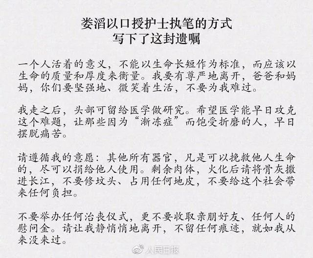 “我走之后,头部可留给医学做研究。希望医学能早日攻克这个难题,让因为‘渐冻症’而饱受折磨的人,早日摆脱痛苦…”2015年,北大女博士娄滔被发现患上“渐冻症”,发病进程十分迅速。她在清醒时口述下这封遗嘱。