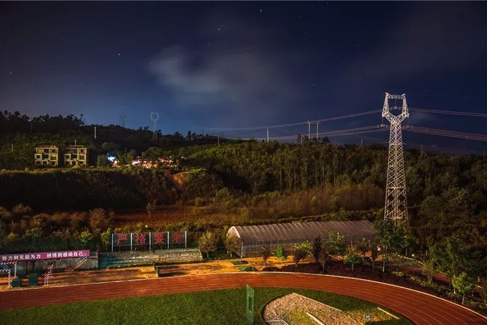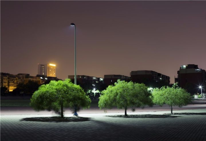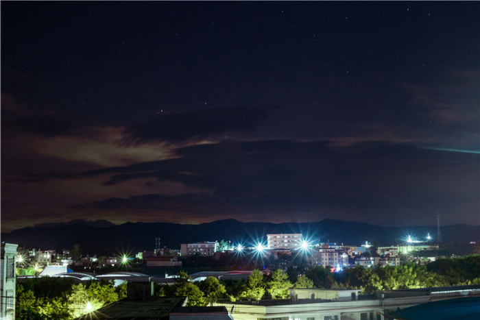 以本图为例,利用画面中的三棵绿树引导观赏者进入夜幕下被教学楼包围的训练场,一盏路灯作为中景有画龙点睛的效果,更丰富了画面的可看性,再加上背景的高楼大厦和广阔纯净的夜空,使得画面整体紧凑却不失大气,层次也更加分明耐看。