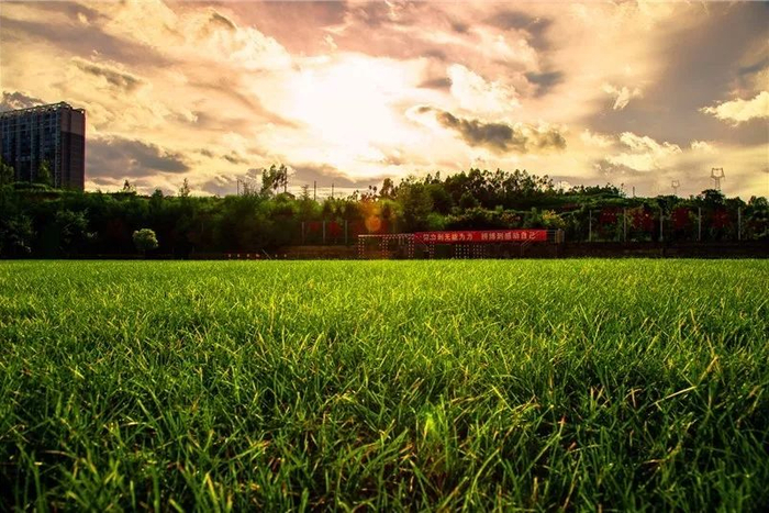 为了加强草地的夸张感,使用广角镜头逼近并压低横向拍摄,强调出草地宽阔的视觉;近端的绿草葱葱郁郁,延伸带出远处“努力到无能为力,拼搏到感动自己”的红色布标,充分展现出作品的趣味组合及空间感。