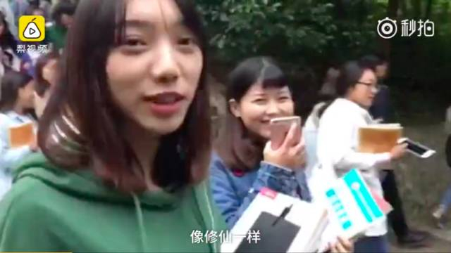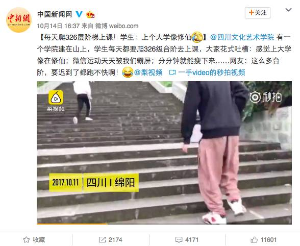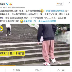 原来是这样的:校园建在山上,学生每天都要爬数百级台阶去上课,据视频微博介绍为326级之多。