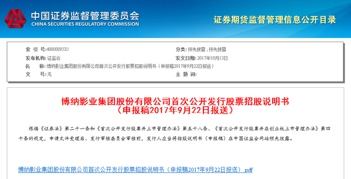 日前,中国证监会官网公布了博纳影业的招股书送审稿,其显示博纳影业拟公开发行股票数量不低于1.22亿股。募集资金扣除发行费用后,6.05亿元拟用于博纳电影项目,8.2亿元拟用于博纳电影院项目。