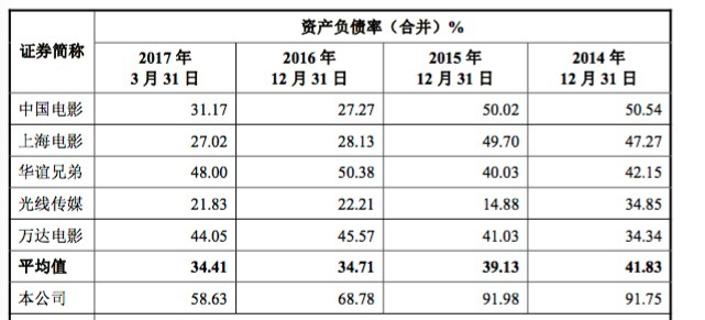 然而,负债率高企是于冬不得不向发审会做出解释的难题。2014-2016年及2017年3月底,博纳影业的资产负债率分别为91.75%、91.98%、68.78%和58.63%,而同行业平均值分别为41.83%、39.13%、34.71%和34.41%。以2017年一季度数据为例,博纳影业的负债率行业最高,其中光线传媒仅为21.83%。