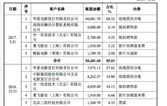 招股书披露的前五大客户显示,2017年第一季度和2016年,博纳影业的第一大客户仍是华夏电影发行有限公司(下称“华夏电影”)——国内仅有的两家进口大片特许发行方之一,有着BAT背景的优酷、美团也位列其中,但不至于让博纳形成高度的营收依赖。