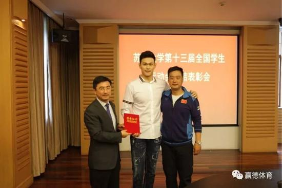 会上,孙杨被苏州大学授予“优秀运动员”称号,苏州大学校长熊思东为孙杨颁发了荣誉证书。