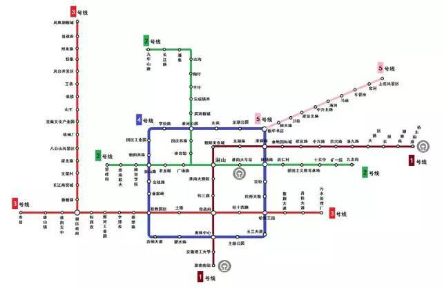 淮南地铁共规划6条线路,呈两主三辅线网形态。全长183km,车站117座。