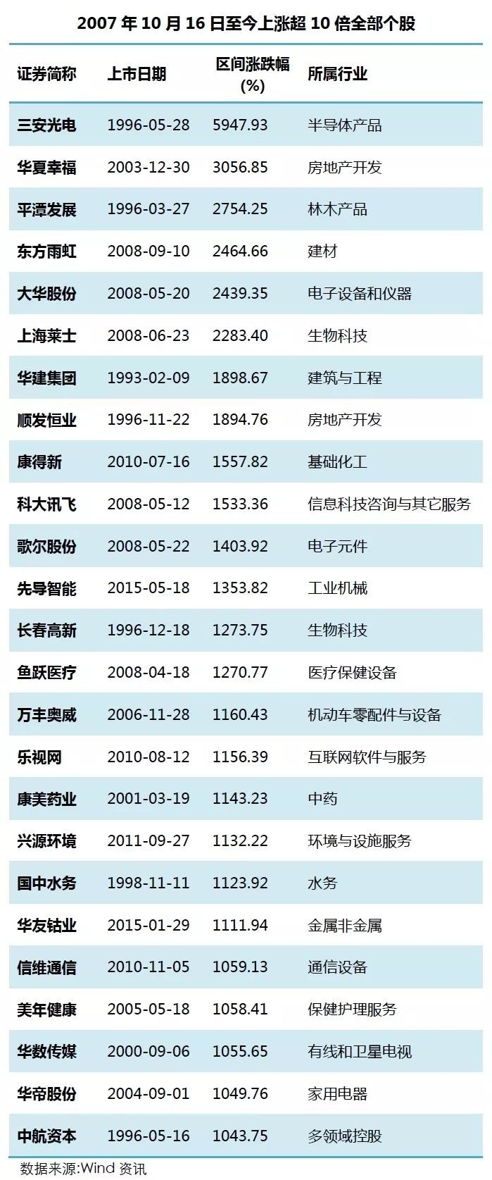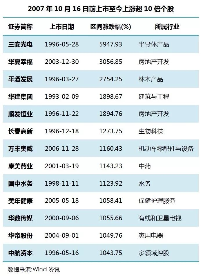 数据显示,在2007年10月16日前上市的公司中,股价出现上涨的公司共有1000家,涨幅超过100%的,有453家,涨幅超过10倍的有13家。