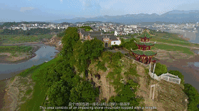 忠县的石宝寨被称为“江上明珠” ,这个地区包括一座石山和山顶的一座庙宇。依山侧而建的红色高耸的庭院被评为世界八大奇特建筑之一。