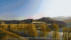 湖上的风雨廊桥采用了明清时期的建筑风格,柱子上的书法作品写的是一首描绘此地美景的诗。