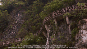 小三峡中有一些小峡谷的奇景,比如龙门峡,游客可以在那里看到一条仿制的古栈道。类似的古栈道是在汉朝时期,用木钉和木板修筑起来的。