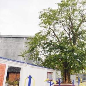 这棵青檀树位于村委会前的一块空地上,根深叶茂,郁郁葱葱,高达15米,其树干直径约1.5米左右,树干中间已经空心。