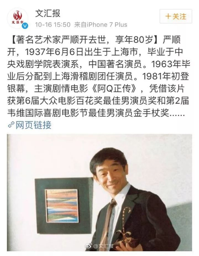 据文汇报10月16日消息,经上海滑稽剧团确认,著名艺术家严顺开于昨日去世,享年80岁。(转载自微信公众号:钱江晚报ID:qianjiangwanbao)