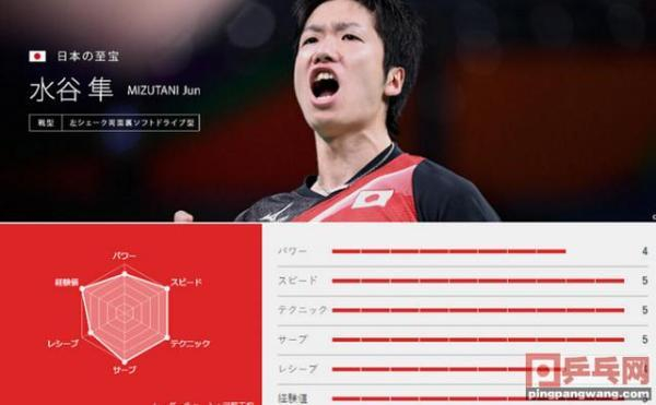 男乒世界第一马龙在防守、经验、发球、力量、速度和技术等六个方面达到了5分的满分,而他对阵的日本球员吉村真晴经验和防守只有2分,其余四项能力值中只有发球和力量两项5分,速度和技术都是4分。
