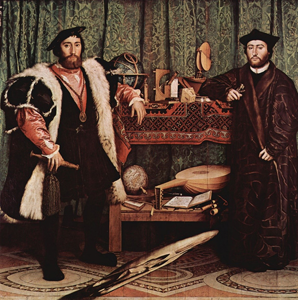 荷尔拜因《大使们》(The Ambassadors),拉康曾在解析这幅画时提出著名的“斜视之见”:图像具有欺骗意义,我们只有通过斜视才能看清画面的底部的骷髅,正如主体的真相只有通过斜视获得。