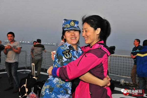 “护航220多天,要问我们苦不苦。说句心里话,没有哪一个女人不希望丈夫陪在自己身边,没有哪一个孩子不需要爸爸关心照顾。但我们知道,我们的丈夫、孩子的爸爸是在为祖国护航,为鲜艳的国旗军旗添彩,是在做崇高而有意义的大事……”范冠卿的家属刘向华发自心底的一席话,让全场的官兵和家属流下了感动的泪水。
