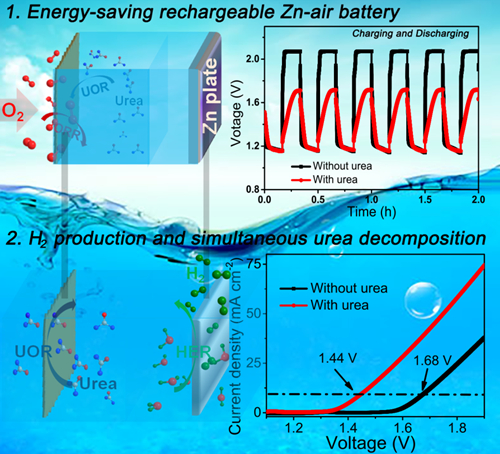 近日,中国科学院合肥物质科学研究院固体物理研究所环境与能源纳米材料中心的研究人员,以尿素氧化降解反应(Urea Oxidation Reaction, UOR)取代高过电位的氧气析出反应(Oxygen Evolution Reaction, OER)为思路,设计并研制出了新型节能的可充电锌-空气电池;同时,基于该思路发展了增强电催化电解水产氢技术。这为新型节能金属-空气电池器件的设计和清洁氢能源的开发利用提供了新思路。相关研究成果发表在Electrochimica Acta和Chemical Communications上。