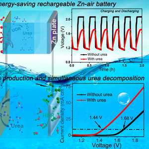 鉴于此,研究人员设计并制备出了多功能Mn-Ni(OH)2/CFC催化剂材料,将其组装成可充电的金属-锌空气电池。通过对比发现,利用UOR取代OER实现的锌-空电池器件,在充电过程中可有效降低锌-空电池的充电电压(约0.3V),因此节约能耗12-21%。将研制的高效Ni2P/CFC催化剂应用到电催化分解水产氢研究,发现利用UOR取代OER后,降低了两电极电解水的电压(约0.2V);利用人体尿液作为电解质可实现电解水高效产氢,电解水产氢的起始电位远低于目前报道的高效OER基电解水制氢的电压,仅需1.33V。以上研究结果为设计和发展高效电化学相关能源器件与技术提供了新思路,展示出实际应用价值。