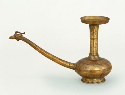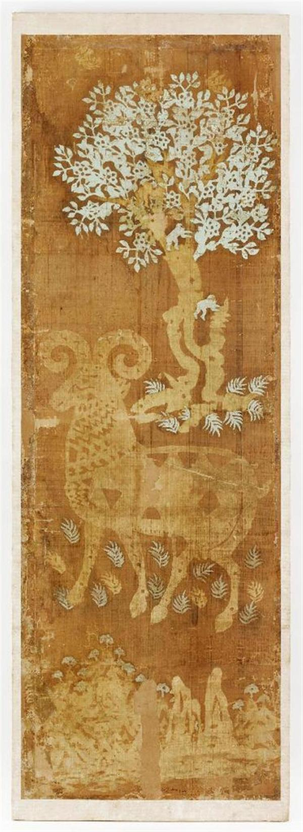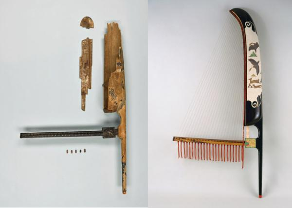 其中,来自北仓的《羊木臈缬屛风》是圣武天皇((701——756)珍爱的私人物品,被视为奈良时期欧亚文化同化的一个很好的例子,屏风上一只卷角公羊站立在树下显示出了强烈的波斯设计风格,但研究已经确认该屏风材料系日本本土制造,反映了天平时代日本对西域文化的吸收。“漆槽箜篌”是失传已久的古乐器,箜篌最早起源于两河流域,通过西域传入中国、朝鲜与日本。还有起源于中国的“绿琉璃十二曲长杯”,充满异域情调的“金铜水瓶”均在展陈之列。
