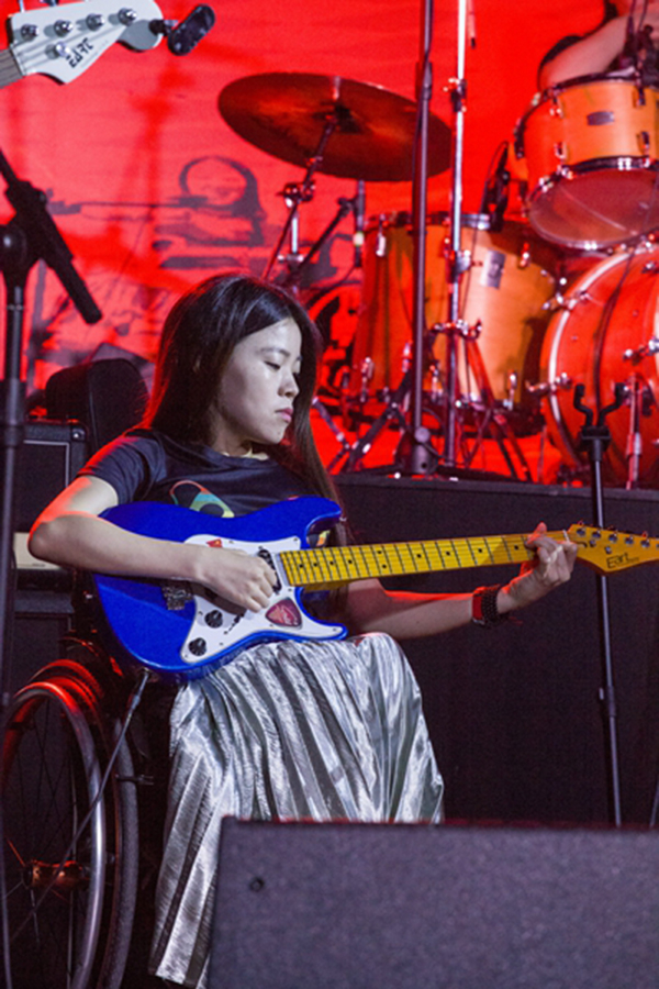 因为成骨不全症,她很小的时侯四肢就停止了生长,踩在轮椅踏板上的双脚无法触碰到地面。因为没法走路,鞋永远都雪白雪白的。攥着吉他拨片的手指,脆弱到可以向外折成90度,甚至可能因用力过猛而骨折。
