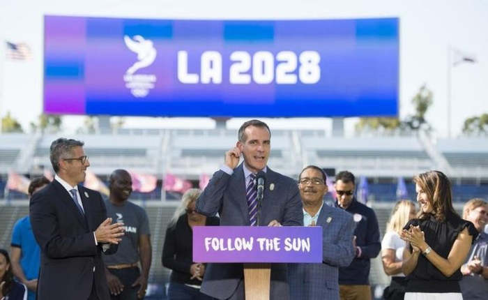 ▲资料图片:7月31日,洛杉矶确定举办2028年奥运会,市长贾赛提出席新闻发布会宣传。