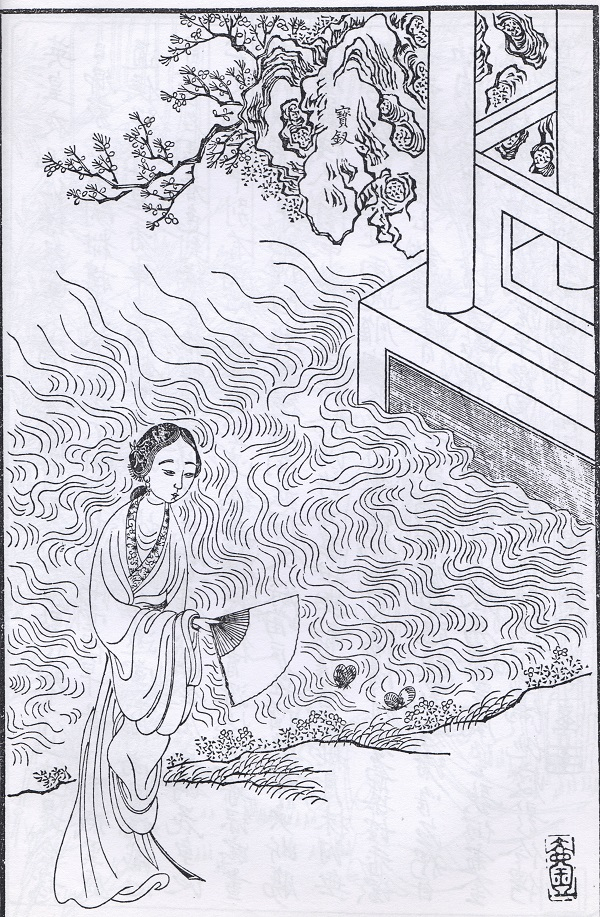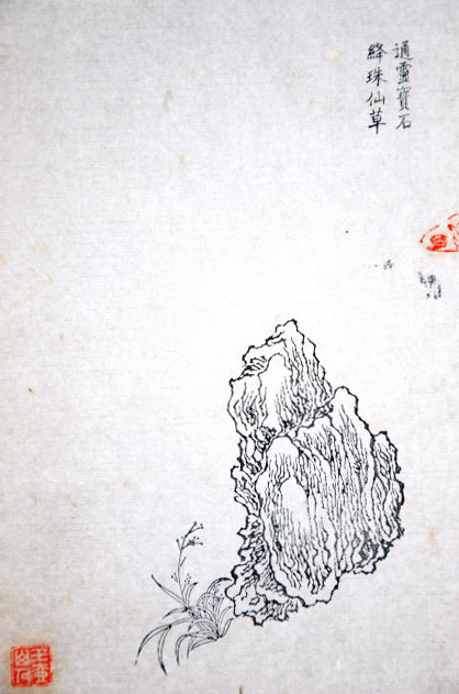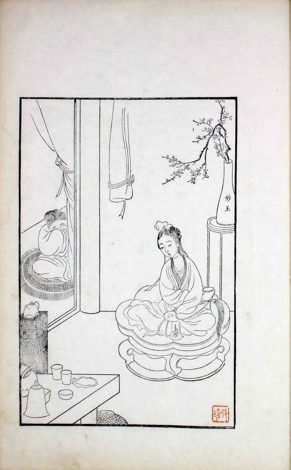 《红楼梦图咏》到底有几种版本?恐怕很难厘清,上海博物馆顾音海先生所撰《红楼梦图咏版本比较》一文中指出,《红楼梦图咏》除了初版本外,还有重印本、翻刻本。初版本为大开本,每册不标序号。而重印本为小开本,某些图像的个别地方吃墨不均,钤盖印章与初印本有相异之处,例如第一幅“通灵宝石绛珠仙草”就少了“玉壶山人”印记,其它画像几乎都不钤印记,也无图序编号。翻刻本则以文元堂版流传较广,与初印本之字体图像均有相异之处,全书分元、亨、利、贞四册,在每一版框右下角栏线外有标示序号,翻刻迹象非常明显。而此文元堂翻刻本又有重印本,扉页书名有“永安画眉”字样。而传世版本问题不在本文重点讨论范畴内。