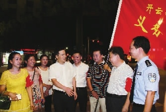 县委书记尹培国(左四)在今年10月1日晚与社区义务巡防队一起夜巡。 李佳辉 摄