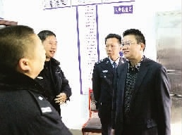 县委常委、县委政法委书记旷志军(右一)在公安机关调研“严打整治”工作。
