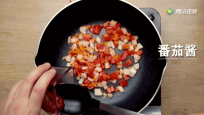 3、加入番茄酱炒一会,再加入方便面,煸炒1分钟。