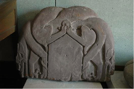唐高宗调露元年(679),在唐安抚大使裴行俭平定匐延都督阿史那都支等人的反叛后,又重置四镇,“立碑于碎叶城,以纪其功”。关于此事,两唐书《裴行俭传》和张说撰《赠太尉裴公神道碑》等皆有明确记载。《旧唐书·裴行俭传》曰:“于是,将吏已下立碑于碎叶城以纪其功,擒都支、遮匐而还。”近年碎叶又发现了一块碑额,现存吉尔吉斯斯坦布拉那博物馆。这个碑额系红色花岗岩质雕琢而成,宽约82厘米、高约60厘米、厚约15厘米。碑额作双狼浮雕。因为上面没有碑铭,我们无法断定其归属,但无论如何,碎叶发现的这个碑额能为研究碎叶川7—8世纪的历史提供翔实的证据。