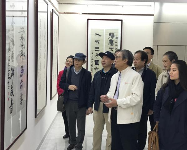 书法家周志高(左四)等在兴化市博物馆观看“周志高书郑板桥诗”展览