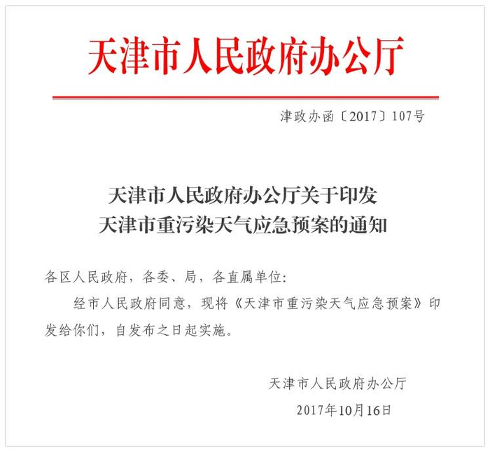 为有效应对重污染天气,最大程度减轻重污染天气对大气环境和人民群众身体健康的影响,10月19日,天津政务网发布了新修订的《天津市人民政府办公厅关于印发天津市重污染天气应急预案的通知》。(以下简称《通知》),此《通知》从自发布之日起实施。