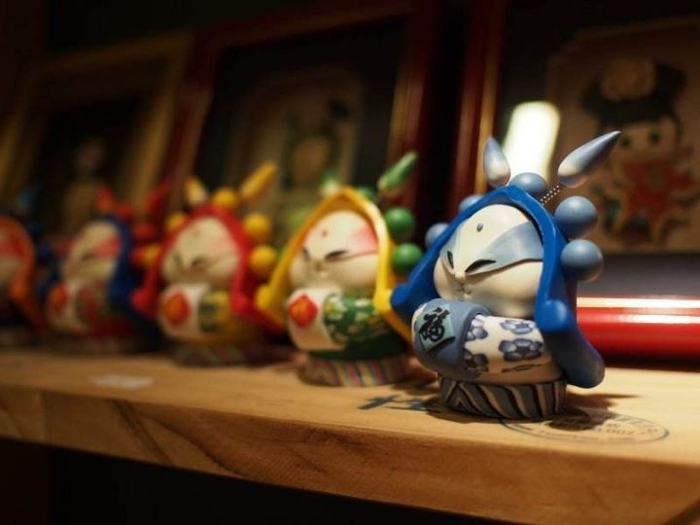 同时,在街上的"香艳的"果摊中间,还有多少个兔儿爷摊子,一层层的摆起粉面彩身,身后插着旗伞的兔儿爷——有大有小,都一样的漂亮工细,有的骑着老虎,有的坐着莲花,有的肩着剃头挑儿,有的背着鲜红的小木柜;这雕塑的小品给千千万万的儿童心中种下美的种子。