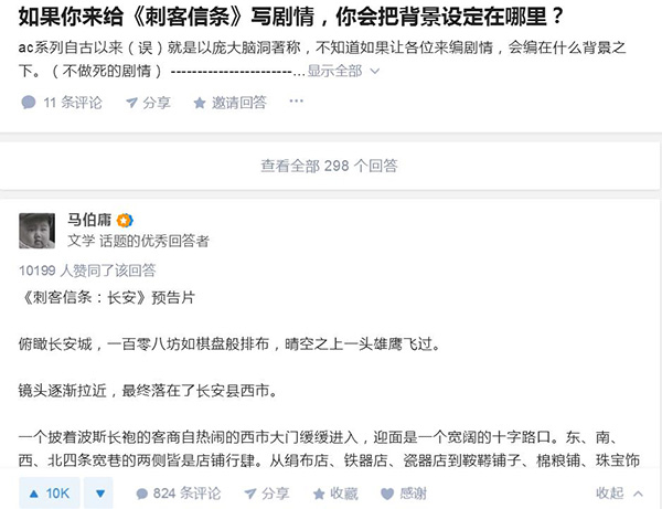 因为知乎上一个问答“如果你来给《刺客信条》写剧情,你会把背景设定在哪里”,马伯庸短短半年间洋洋洒洒地创作了四十余万字的《长安十二时辰》,在中国古代小说中融入美剧般的快节奏,读来惊心动魄,令人十分过瘾。