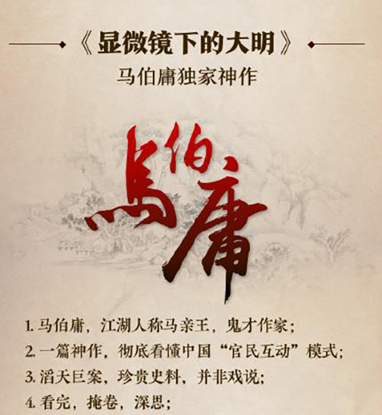 2016年12月,罗辑思维花10万元买下马伯庸《显微镜下的政治生态——大明万历初年的徽州丝绢案纷争》一文,马伯庸则通过微博寻人将稿费交给对他文章有贡献的四位论文作者。从徽州丝绢案到知识有价、微博营销,网友热议不断。