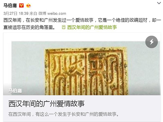2017年3月,马伯庸在一次游玩后写下《西汉年间的广州爱情故事》,一块文物印鉴背后的曲折情史引得西汉南越王博物馆游客激增。