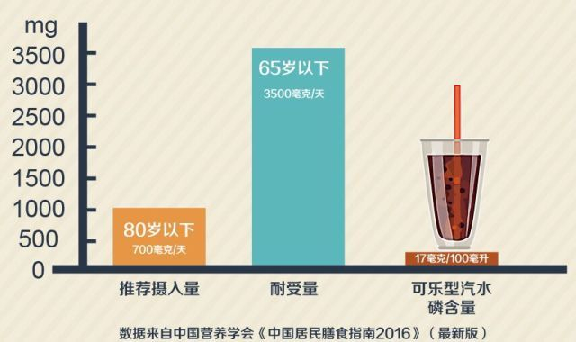 根据中国营养学会提供数据,成年人每天的磷元素摄入量是700毫克,相当于约合12罐330毫升可乐型汽水(每100毫升可乐型汽水的磷含量为17毫克)中的磷含量总量。而健康的成年人每天摄入磷元素的耐受量则是3500毫克,约合相当于62罐330毫升可乐型汽水中的磷含量总量。[4]